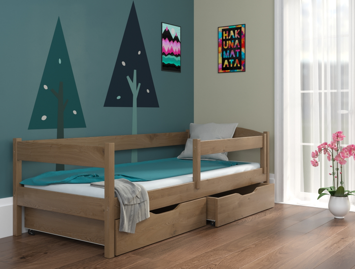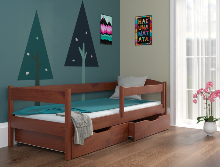 Ліжко в дитячу кімнату з натурального дерева односпальне з бортиком і ящиками ТМ ЛУНА Мартель 90х200 горіх світлий (без матр