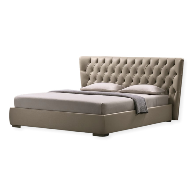 Ліжко двоспальне м'яке з каретною стяжкою MeBelle KAROONA 180х200, бежевий пісочний преміальний шкірозамінник.