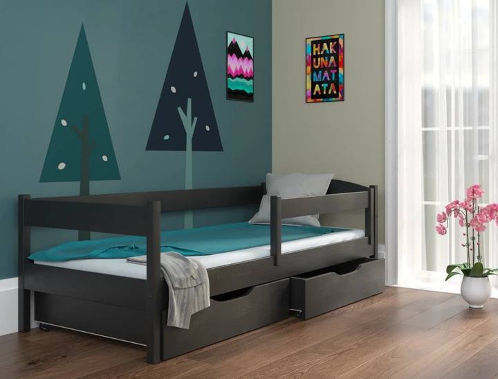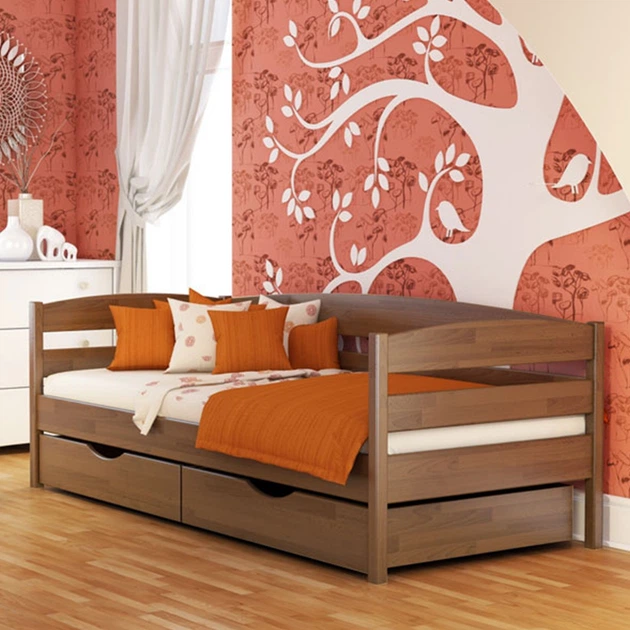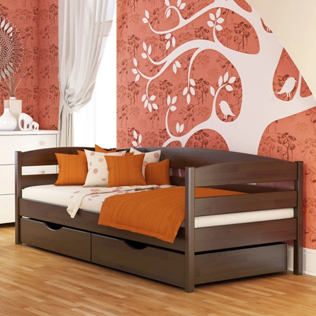 Ліжко односпальне в дитяче з натурального дерева Мартель 80х200 з бортиком та ящиками горіх темний Luna (без матраца)