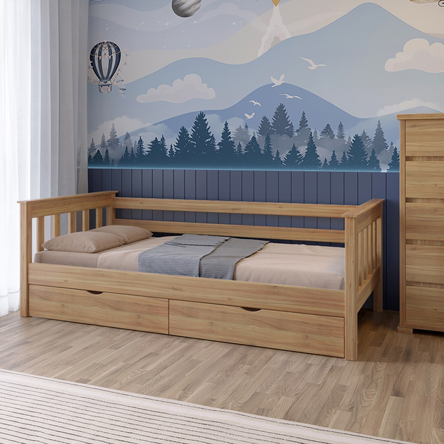 Дитяче ліжко Mebigrand Скандинавія Літл-2 Горіх світлий 90х200 см із заднім бортиком та ящиками (MBG-2627)