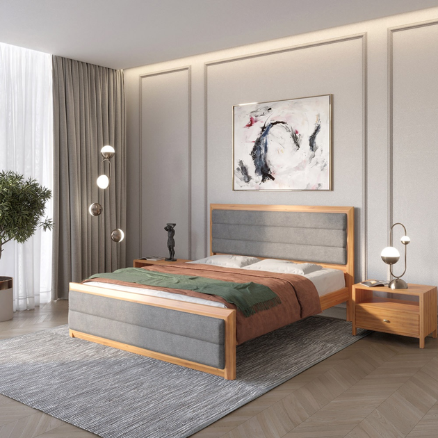 Ліжко двоспальне з м'яким узголів'ям Лондон ДК 180х200 MebiGrand Горіх світлий/Бежевий (натуральне дерево/тканина Аляска 23)