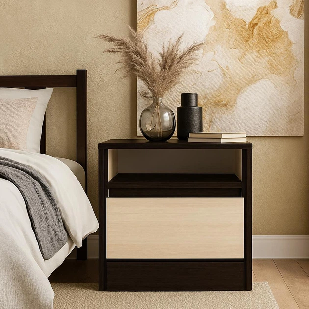 Маленька стильна сучасна приліжкова тумбочка з висувною шухлядою та відкритою поличкою для дрібниць нічна тумба в спальню 45