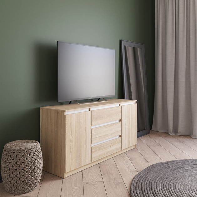Комод тумба ТВ на 3 висувних шухляди та дві двері з фасадами без ручок R-15 Дуб Сонома \ Білі планки