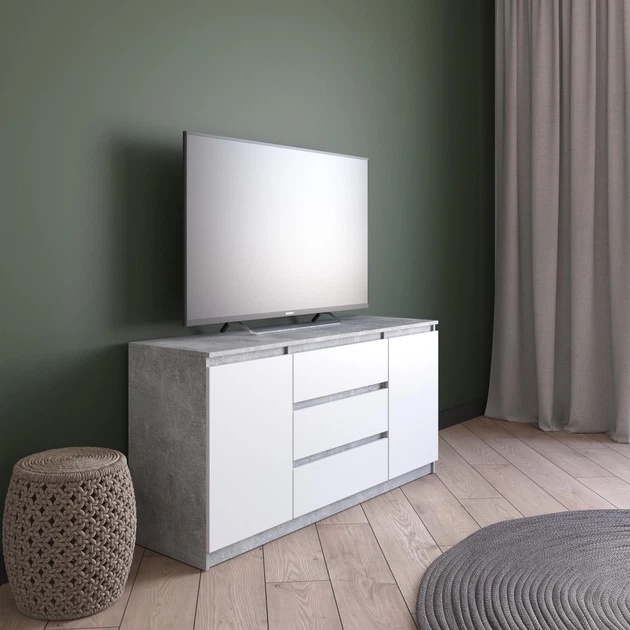 Комод тумба ТВ на 3 висувних шухляди та дві двері з фасадами без ручок R-15 Бетон \ Білий фасад