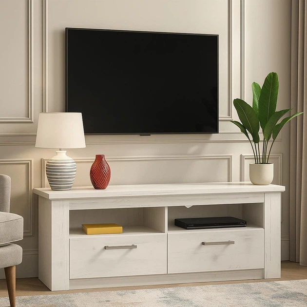Стильна маленька низька класична тумба під телевізор тв 2Ш з відкритими поличками та двома висувними шухлядами у вітальню ди