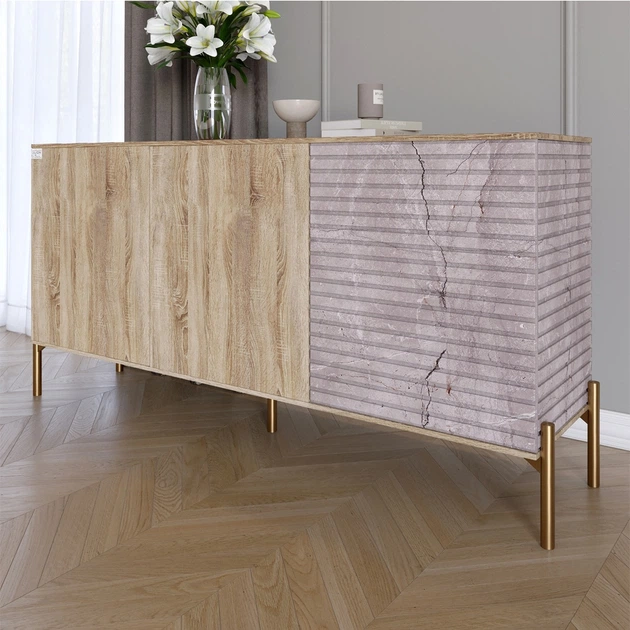 Комод закритий у вітальню на золотих металевих ніжках LION Грей 154x38x76,5 см Дуб сонома/Камінь (LION-041857)