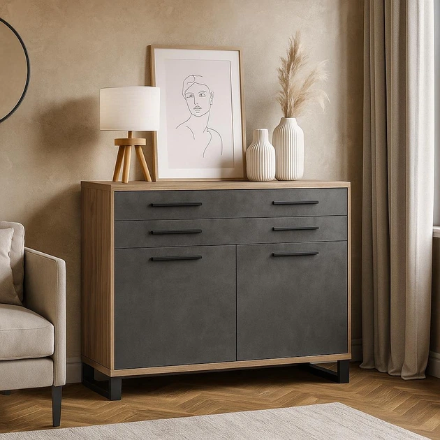 Містка стильна тумба-комод з висувними ящиками в стилі лофт у вітальню Меблі Сервіс "Омега" 120х109х55 см дуб табако-матера
