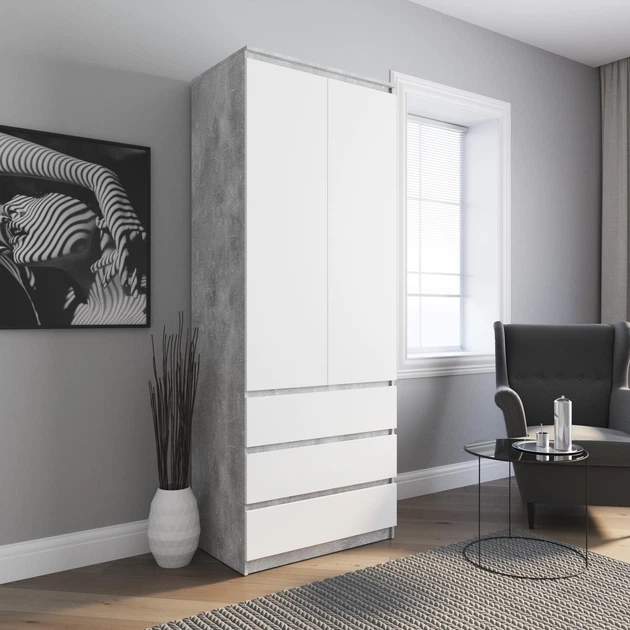 Шафа VAYS для одягу зі штангою на 3 висувних шухляди з фасадами без ручок R-9 Бетон \ Білий фасад