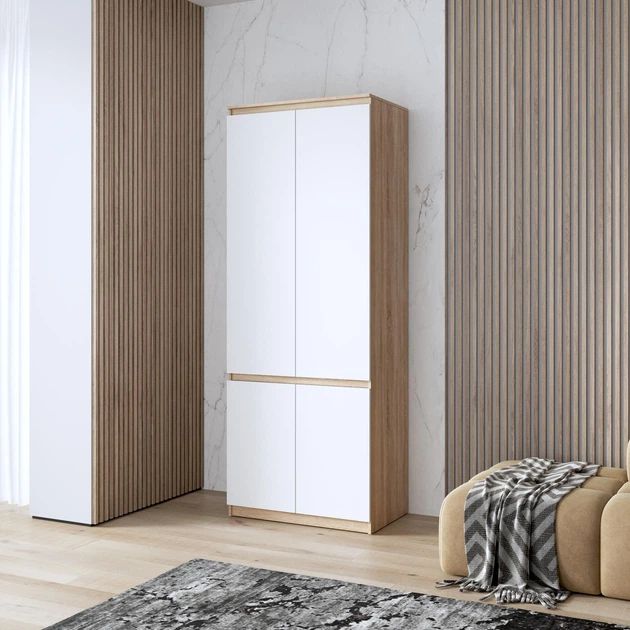 Шафа для одягу з полицями, фасади без ручок R-24, дуб сонома/білі фасади