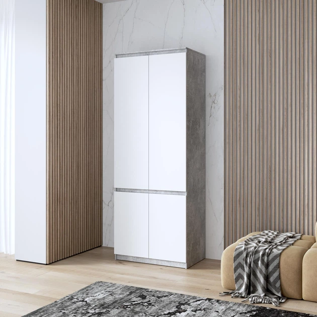 Шафа для одягу з полицями, фасади без ручок R-24, бетон/білі фасади
