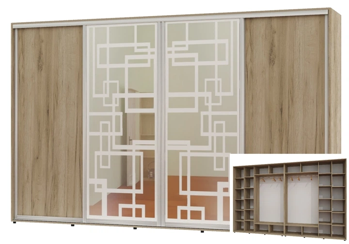 Шафа-купе чотиридверна Алекса 370*60*230 Сосна Натті 2 ДСП/2 Дзеркала з піскострумним малюнком