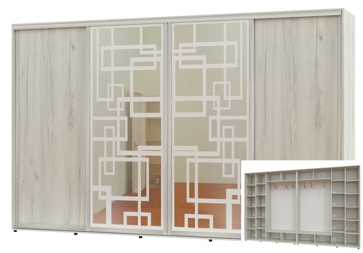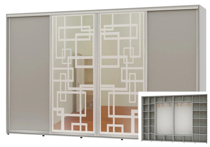 Шафа-купе чотиридверна Алекса 370*60*230 Кашемір 2 ДСП/2 Дзеркала з піскострумним малюнком