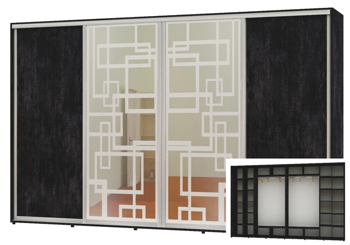 Шафа-купе чотиридверна Алекса 380*60*240 Бетон темний 2 ДСП/2 Дзеркала з піскострумним малюнком
