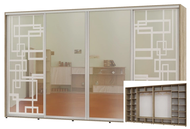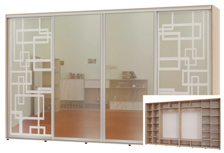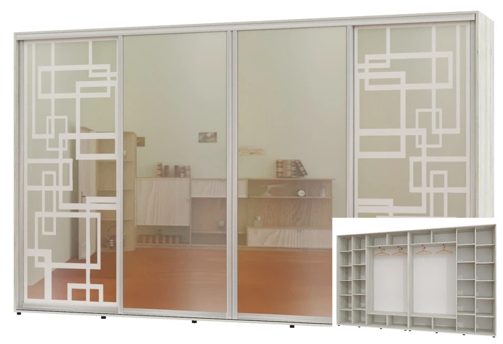 Шафа-купе чотиридверна Алекса 410*45*230 Дуб молочний 2 Дзеркала з піскострумним малюнком/2 Дзеркала