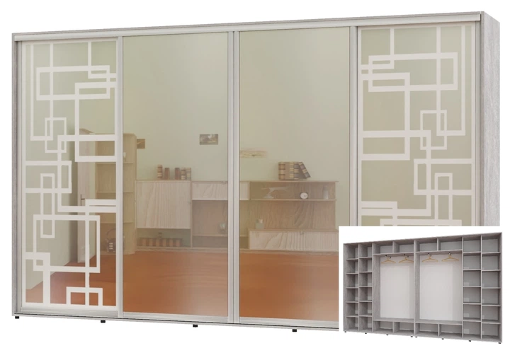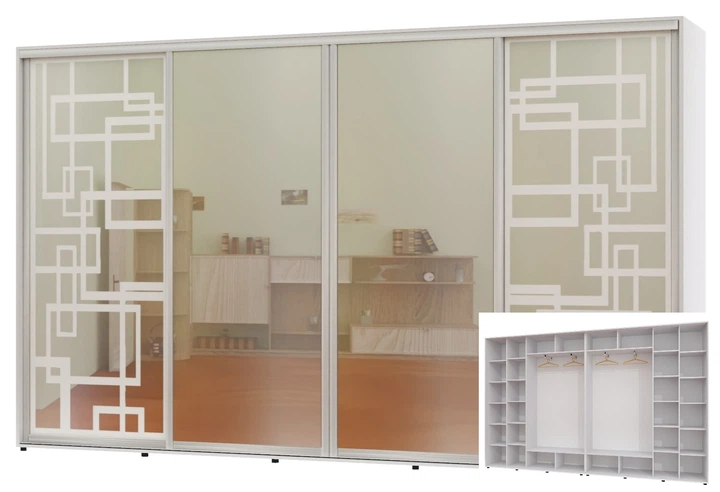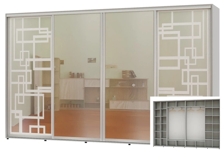 Шафа-купе чотиридверна Алекса 410*45*230 Білий 2 Дзеркала з піскострумним малюнком/2 Дзеркала
