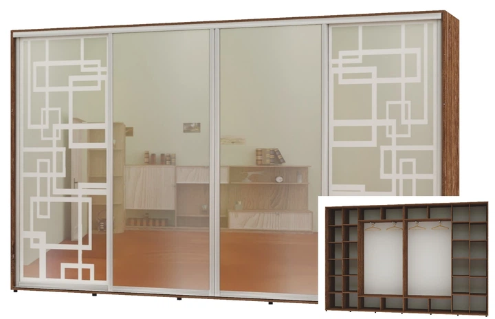 Шафа-купе чотиридверна Алекса 410*45*240 Горіх лісовий 2 Дзеркала з піскострумним малюнком/2 Дзеркала