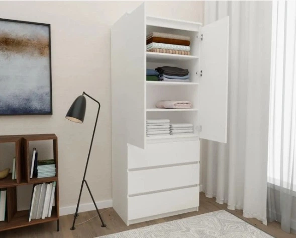 Шафа VAYS для одягу з полицями на 3 висувних шухляди, фасади без ручок R-16 Дуб Сонома-Білий фасад