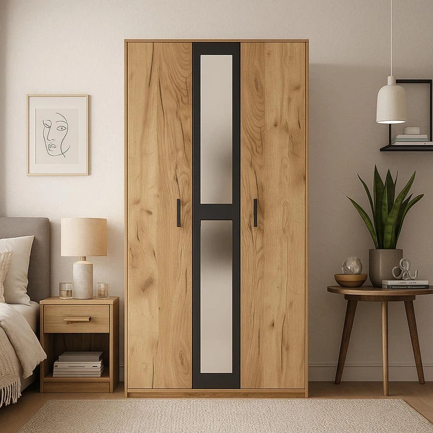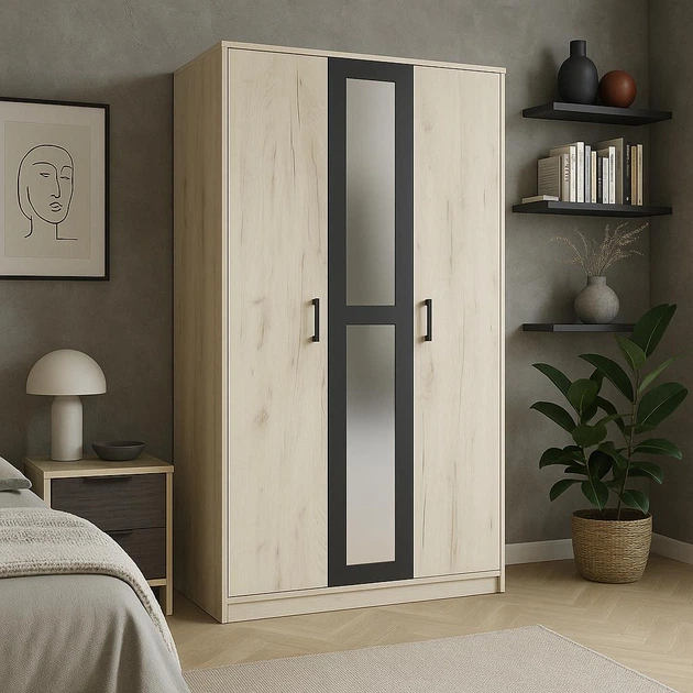 Сучасна платтяна шафа розпашна тридверна з дзеркалом 120 см для одягу та білизни з полицями і штангою модерн у спальню кімна