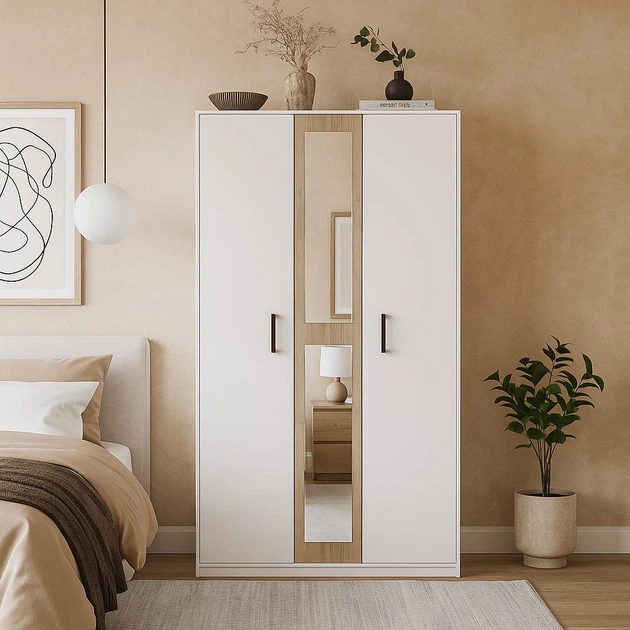Сучасна платтяна шафа біла розпашна тридверна з дзеркалом 120 см для одягу та білизни з полицями і штангою модерн у спальню