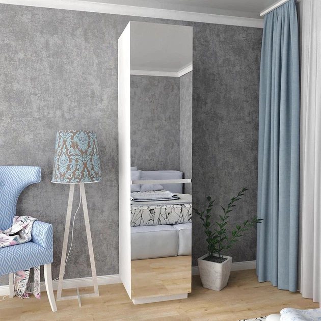 Стильна висока шафа пенал біла з дзеркалом 50 см розпашна для одягу зі штангою та полицями глибиною 55 см підлогова закрита