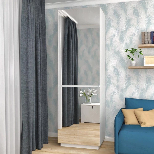 Стильна невелика розпашна біла шафа дводверна з дзеркалом 60 см для одягу з полицями та штангою без ручок у маленьку спальню