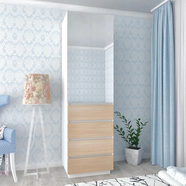 Стильна маленька розпашна шафа біла дводверна з дзеркалом 60 см для одягу з шухлядами та штангою без ручок висока в спальню