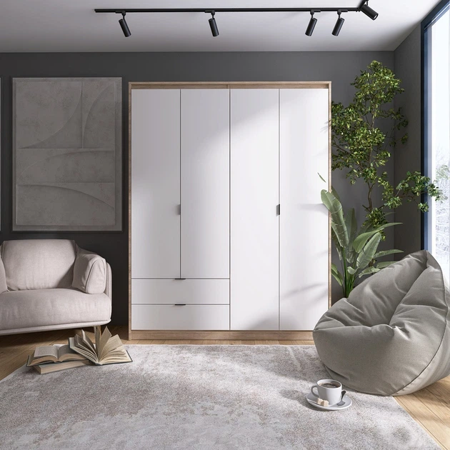 Шафа розпашна для одягу з висувними шухлядами (полиці - штанга) Эверест Стайл-1400 140х53х203 см Німфея Альба (білий)/Канелл