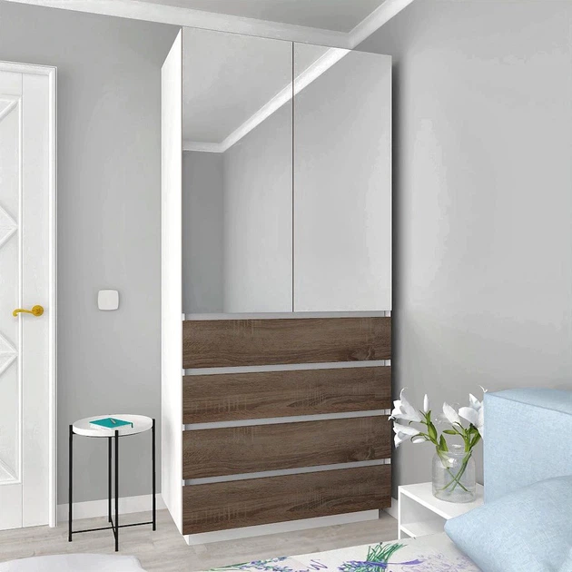 Сучасна невелика розпашна дводверна шафа з дзеркалом 100 см для одягу з ящиками та штангою без ручок висока для маленької кі