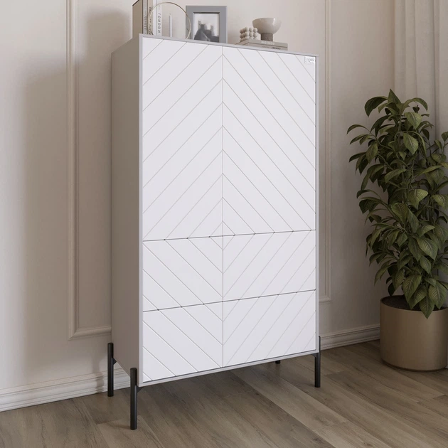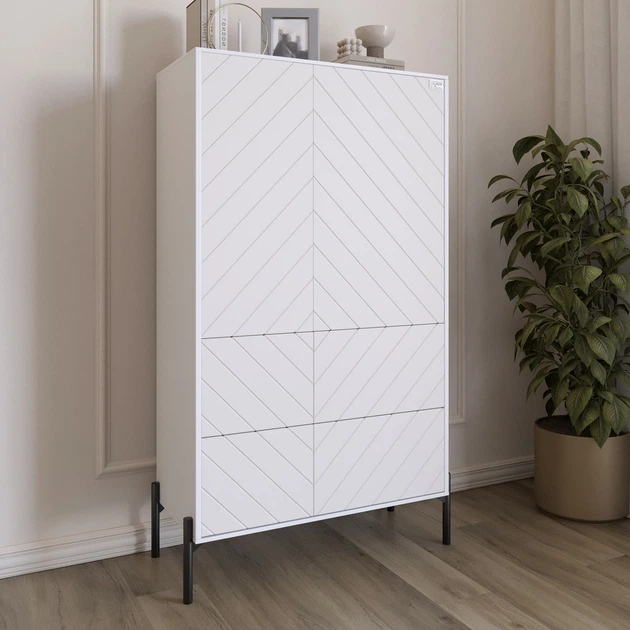 Комод-пенал з рельєфним оздобленням фасаду та чорними металевими ніжками LION Амарант 84x40x150 см Німфея Альба (білий)/Біли