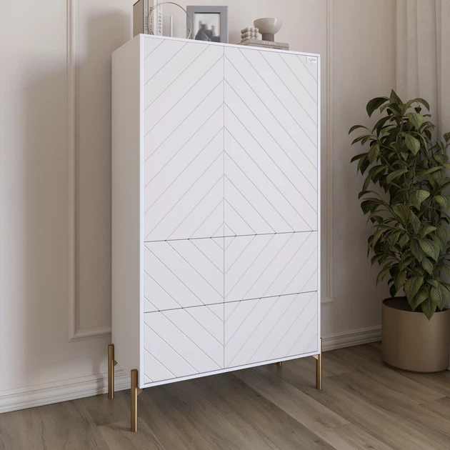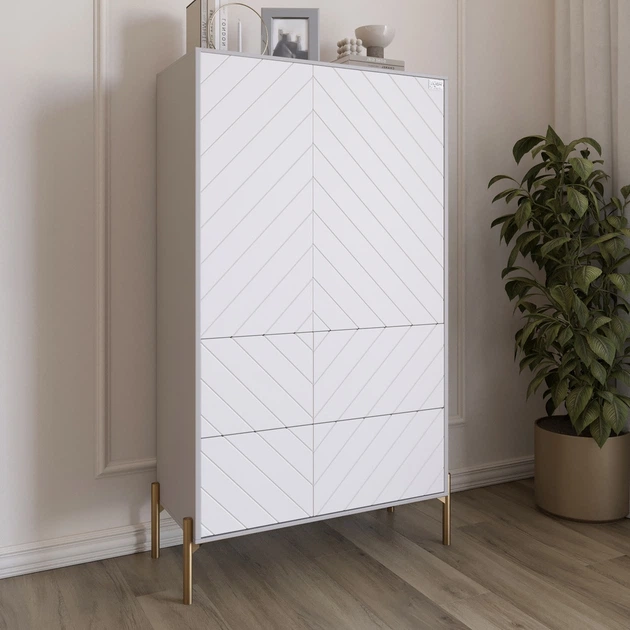 Комод-пенал з рельєфним оздобленням фасаду та золотими металевими ніжками LION Амарант 84x40x150 см Німфея Альба (білий)/Гра