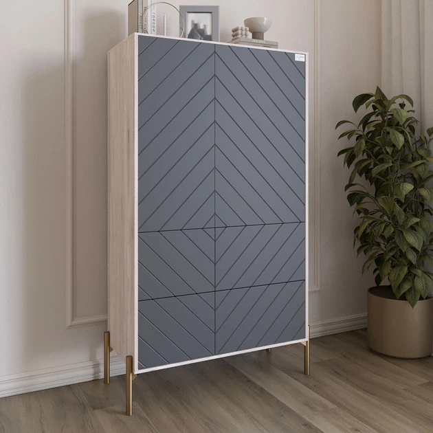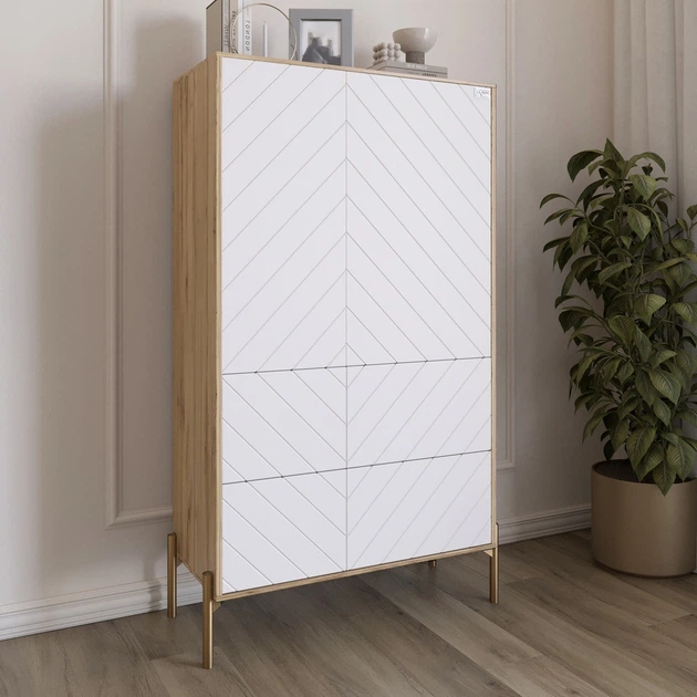 Комод-пенал з рельєфним оздобленням фасаду та золотими металевими ніжками LION Амарант 84x40x150 см Дуб Аппалачі/Білий (LION