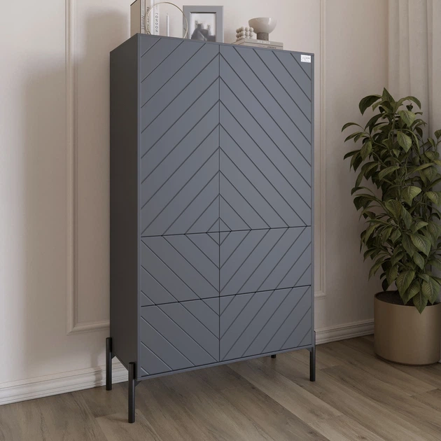 Комод-пенал з рельєфним оздобленням фасаду та чорними металевими ніжками LION Амарант 84x40x150 см Антрацит/Графітовий (LION
