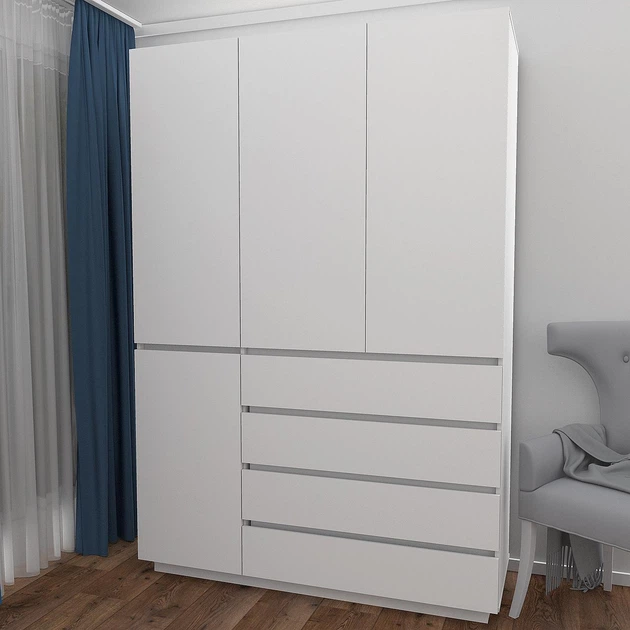 Стильна розпашна тридверна шафа платтяна біла 150 см для одягу без ручок з полицями і штангою з ящиками висока в спальню віт