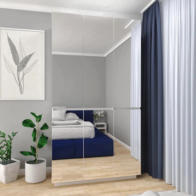 Сучасна розпашна тридверна шафа біла з дзеркальними дверцятами 120 см висока для одягу з полицями та двома штангами в кімнат