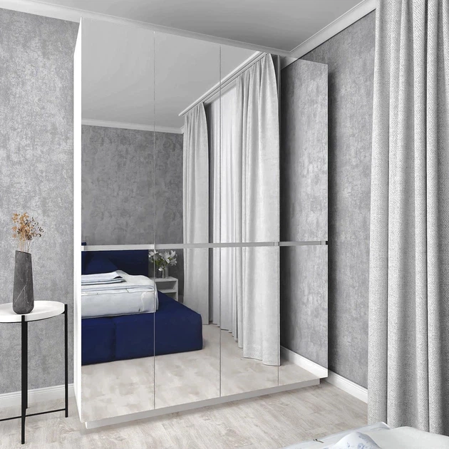 Сучасна висока біла шафа чотиридверна розпашна з дзеркальними дверцятами 160 см для одягу з полицями з двома штангами в спал