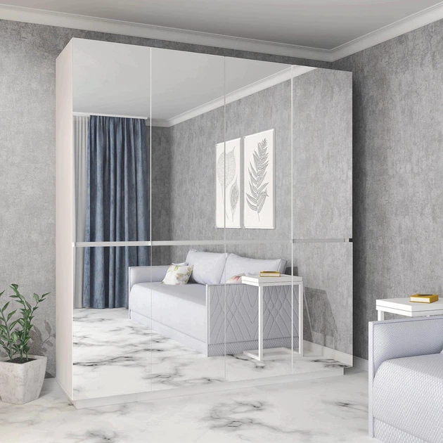 Стильна велика чотиридверна шафа 2 метри біла з дзеркальними дверцятами розпашна висока для одягу з полицями з двома штангам