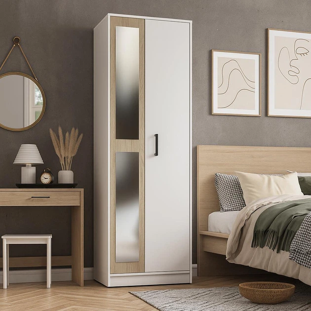 Сучасна маленька шафа біла платтяна розпашна дводверна з дзеркалом 70 см для одягу в стилі модерн у спальню кімнату ЛДСП Вів