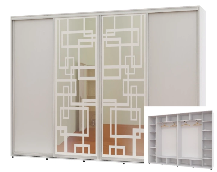 Шафа-купе чотиридверна Алекса 280*45*220 Білий 2 ДСП/2 Дзеркала з піскострумним малюнком