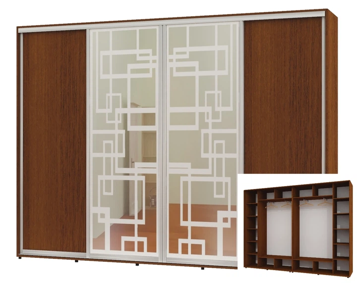Шафа-купе чотиридверна Алекса 280*45*220 Горіх лісовий 2 ДСП/2 Дзеркала з піскострумним малюнком