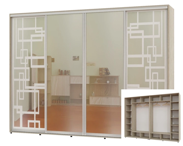 Шафа-купе чотиридверна Алекса 300*45*240 Дуб молочний 2 Дзеркала з піскострумним малюнком/2 Дзеркала