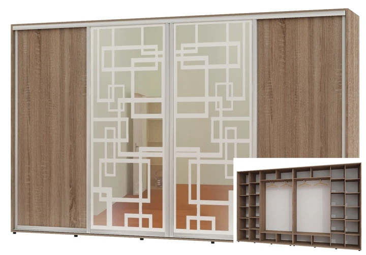 Шафа-купе чотиридверна Алекса 400*45*230 Дуб Сонома трюфель 2 ДСП/2 Дзеркала з піскострумним малюнком