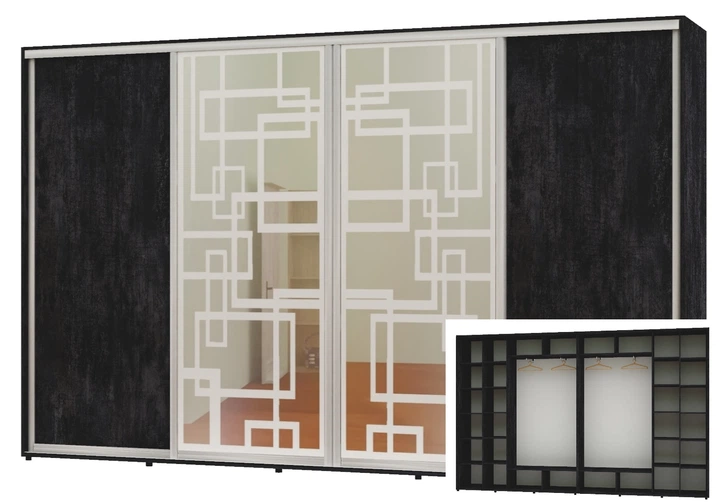 Шафа-купе чотиридверна Алекса 390*45*240 Бетон темний 2 ДСП/2 Дзеркала з піскострумним малюнком