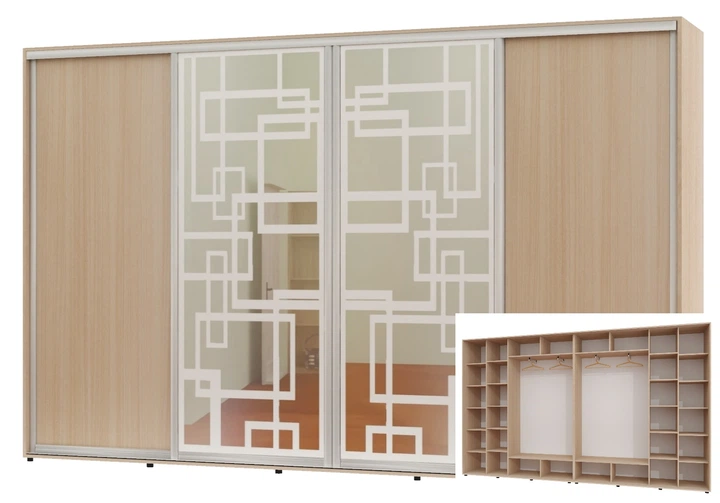 Шафа-купе чотиридверна Алекса 400*45*240 Дуб молочний 2 ДСП/2 Дзеркала з піскострумним малюнком