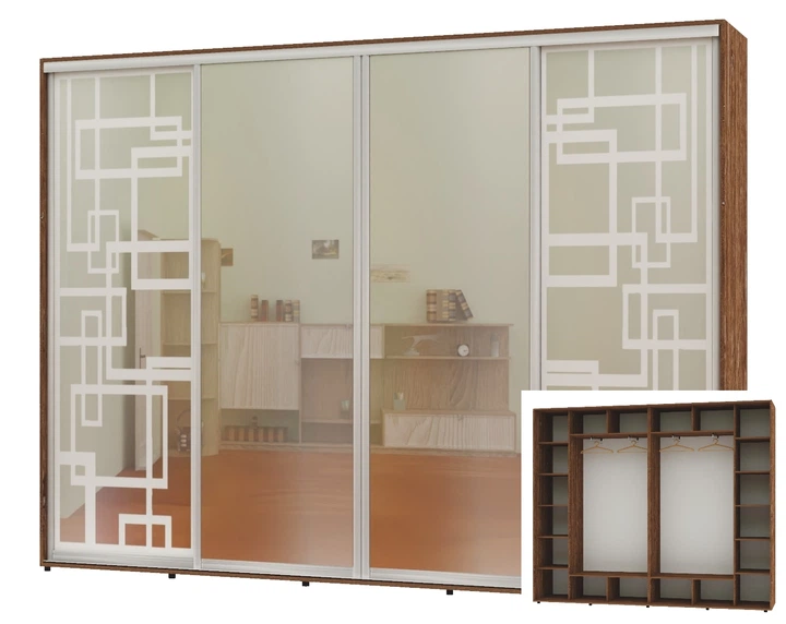 Шафа-купе чотиридверна Алекса 350*45*250 Горіх селект кам'яний 2 Дзеркала з піскострумним малюнком/2 Дзеркала