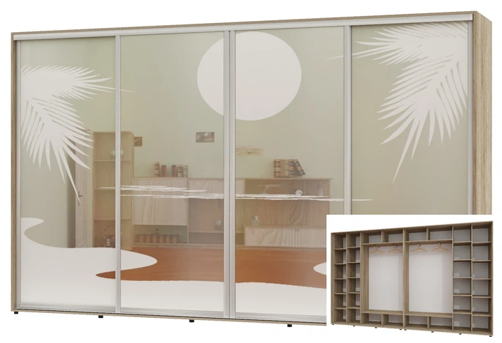 Шафа-купе чотиридверна Алекса 370*45*220 Дуб крафт білий Дзеркало з піскострумним малюнком