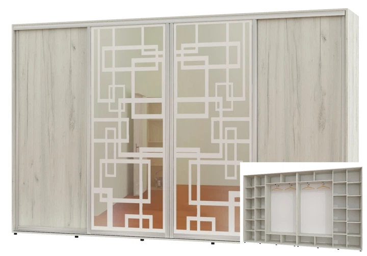 Шафа-купе чотиридверна Алекса 390*45*240 Дуб крафт білий 2 ДСП/2 Дзеркала з піскострумним малюнком