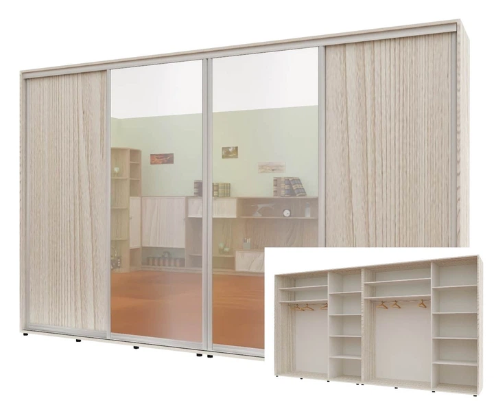 Шафа-купе чотиридверна Комфорт Меблі 340*60*220 см Дуб молочний ДСП + Дзеркало + Дзеркало + ДСП Стандарт