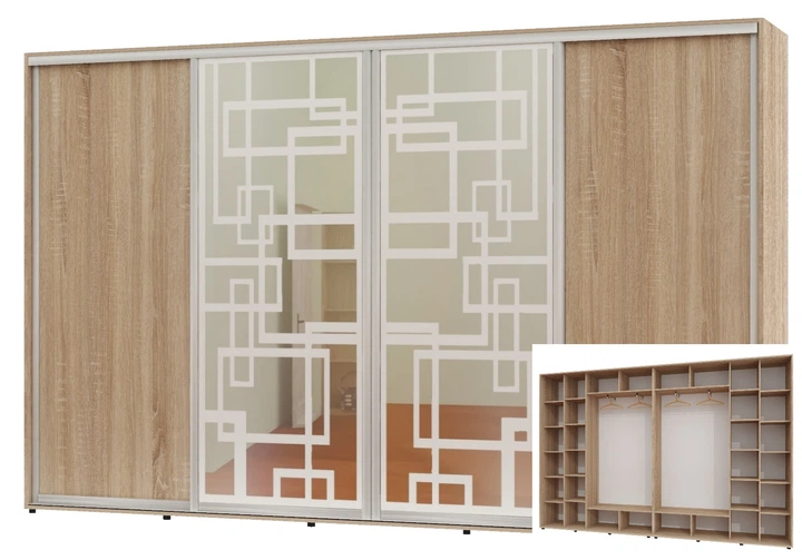 Шафа-купе чотиридверна Алекса 390*45*240 Дуб молочний 2 ДСП/2 Дзеркала з піскострумним малюнком