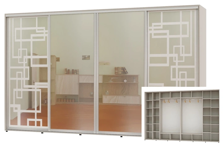 Шафа-купе чотиридверна Алекса 370*60*220 Кашемір 2 Дзеркала з піскострумним малюнком/2 Дзеркала
