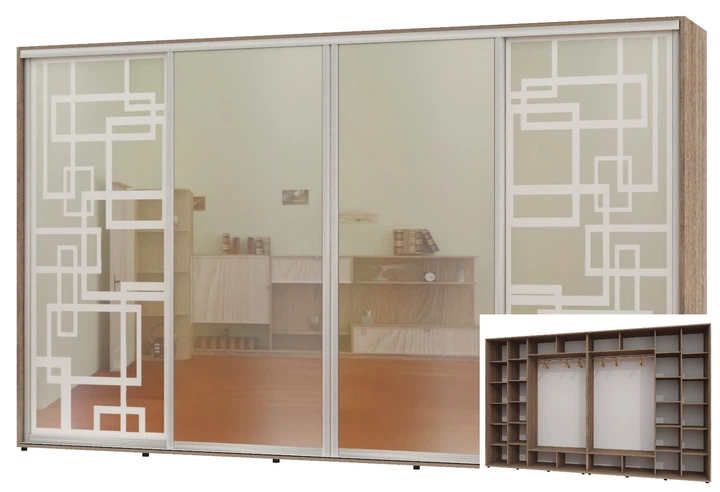 Шафа-купе чотиридверна Алекса 380*60*220 Дуб Сонома трюфель 2 Дзеркала з піскострумним малюнком/2 Дзеркала